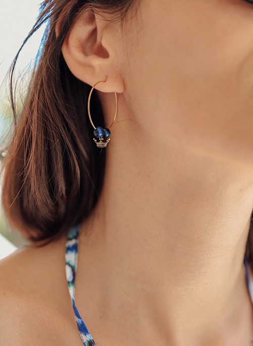 Gold-plated brass (1 micron) with hawk's eye gemstones.