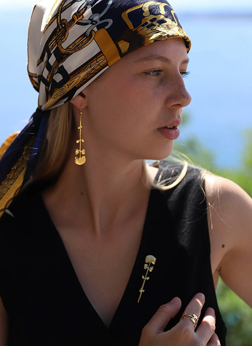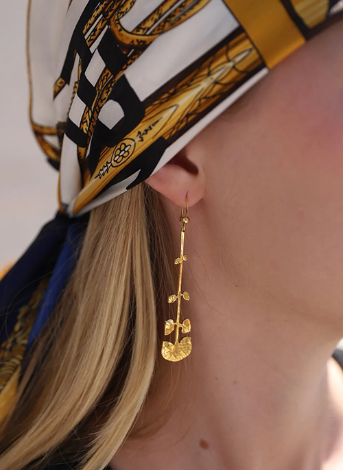 Gingko earrings in 24k gold-plated brass. Handmade from a stamped piece crafted in France. Guaranteed nickel- and lead-free. Eco-friendly manufacturing.