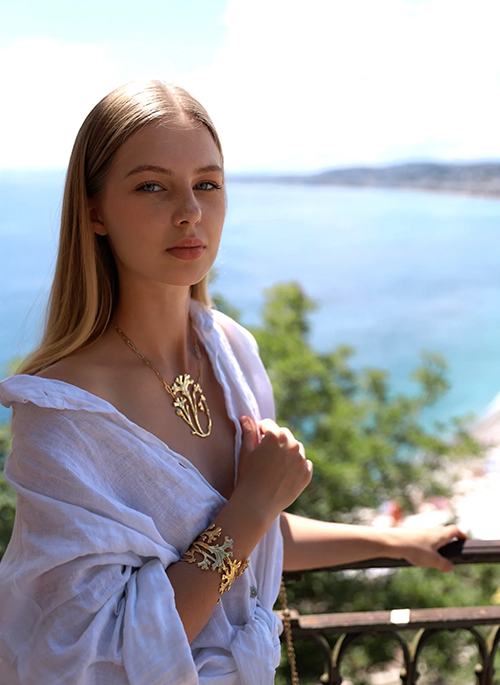Coral bracelet in 24k gold-plated brass. Details: Handmade from a stamped piece crafted in France. Guaranteed nickel and lead free. Eco-friendly manufacturing. Adjustable size.