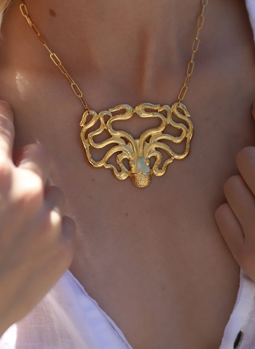 Octopus necklace in 24k gold-plated brass. Details: Handmade from a stamped piece crafted in France.Guaranteed nickel- and lead-free. Eco-friendly manufacturing. Adjustable length.