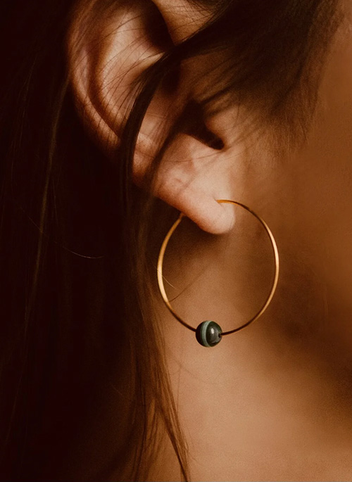 24k gold-plated brass hoop earrings with a malachite gemstone. Handmade in France. Diameter 30 mm. Nickel and lead free. Eco-friendly manufacturing.