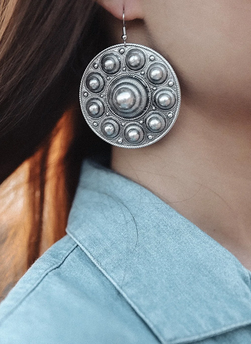 Maya earrings in silver-plated brass. Handmade from stamped pieces crafted in France. Guaranteed nickel- and lead-free. Eco-friendly manufacturing.