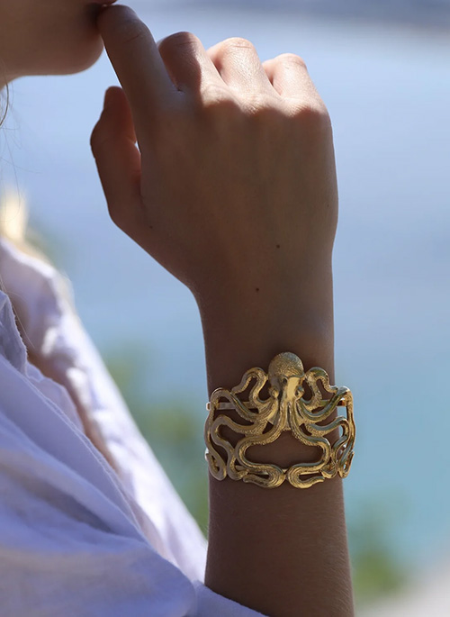 Octopus cuff bracelet in 24k gold-plated brass. Handmade from a stamped piece crafted in France. Guaranteed nickel and lead free. Eco-friendly manufacturing. Adjustable size.