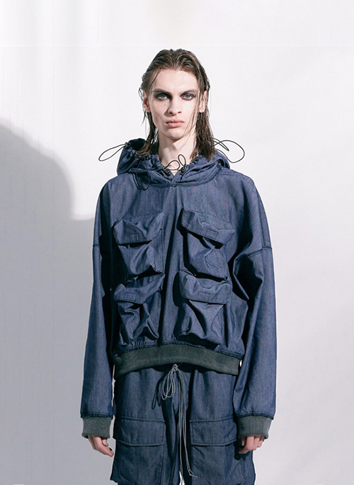 Details: 3D POCKET HOODIE OVERSIZED FIT FULLY INSIDE OUT ALL SEEMS OUT MULTI-DRAWSTING AT HOOD 3D POCKET SUPPLIER COLOR: BLUE 100% POLY MADE IN SOUTH KOREA FW-23-HD-08 MODEL IS 185cm AND WEARS SIZE M