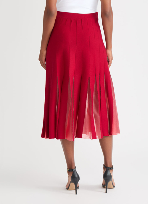 Designed for both comfort and sophistication, this A-line midi skirt features a soft knit construction with sheer paneling at the hem for a touch of modern allure. Its pull-on design and elastic no-roll waistband provide ease and fit, while the flowing silhouette moves gracefully from day to evening occasions.