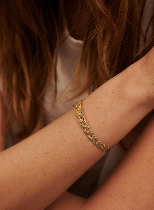A true symbol of love, the Aina bracelet is composed of three links intertwining for life: joy, trust and complicity. An elegant gold braid punctuated with colored precious stones. This bangle is also available as a ring. The Aina bracelet 1 Yellow is handmade in 18-carat yellow gold and set with 110 precious stones: 35 emeralds, 35 yellow sapphires and 40 cognac sapphires. The width of the bracelet is 0.7cm.Details: