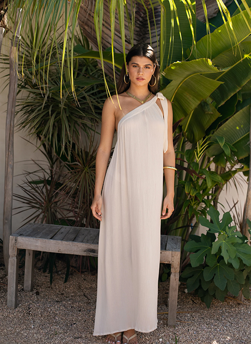 Get ready to fall in love with our beloved Angel Maxi Dress, now in a fresh eco-friendly Rayon Crinkle fabric in our signature Oatmilk shade! This breezy long dress features a fun one-shoulder cut and an adjustable bow, letting you style it your way. With its relaxed fit, you can rock it with or without the matching belt for effortless flair. A part of the Eco Luxe by Berawa Luxe range, this fabric is produced entirely in Indonesia and integrates farm to fabric operation, ensuing ethical and sustainable practices along the supply chain.Details: