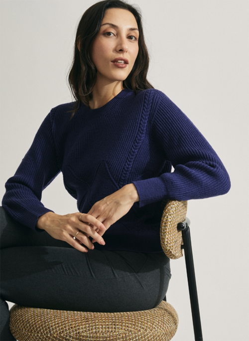 The Auran Nuit sweater is a navy blue French pure wool sweater with a knitted round neck with a pretty set of diamond stitches and pearl ribs with twists.