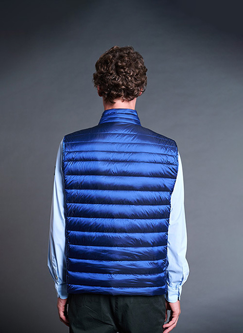 Men's short vest. Custom double-zipper closure. Pockets with custom zippers. Packable. Water-repellent.Details: 90% Down / 10% FeatherDouble-carriage zipper