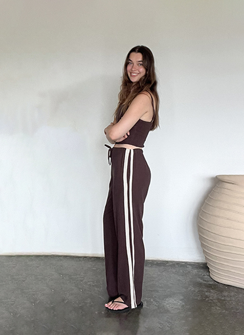 The Avriel Pants in Espresso combine the luxurious feel of our signature linen rayon crepe fabric with thoughtful design details. Featuring a comfortable drawstring and elastic waist, they provide a tailored fit with ease. Natural-colored racing stripes add a fun accent, complementing the matching Marcy Top for a coordinated summer vibe.Details: