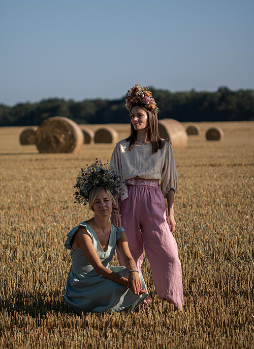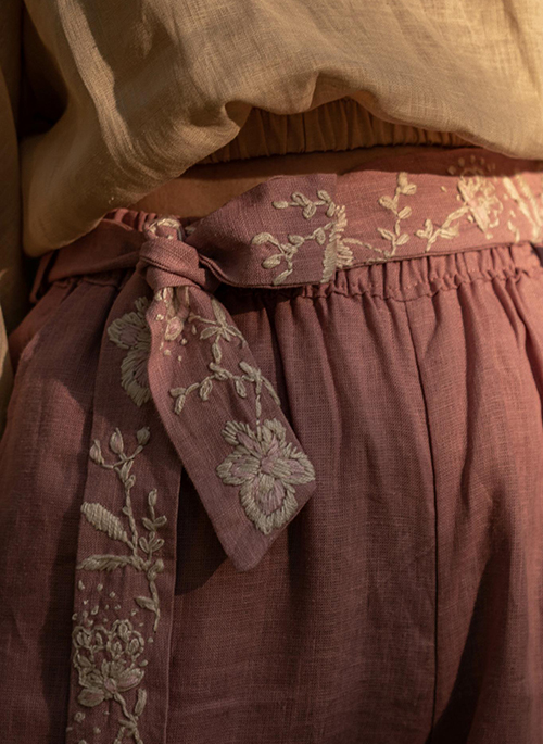 Details: 100% organic linen 100% handmade High waist With pockets 180 g/m2 Coconut buttons Elastic around the waist Hand-embroidered waistband Sold with the embroidered waistband + plain waistband but you can choose the more casual mode