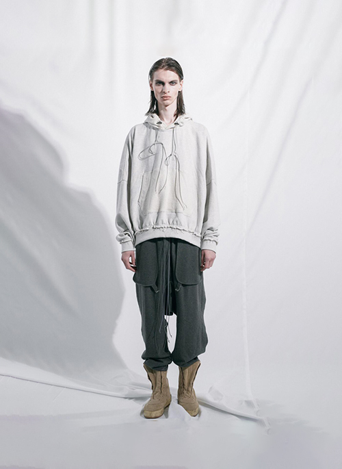 Details: INSIDE OUT BAGGY PANTS GR THREE POCKET STYLING SIDE PANEL WITH RAW CUT DRAWSTING AT WAISTBAND SUPPLIER COLOR: GREY 100% COTTON MADE IN SOUTH KOREA FW-23-PT-09 MODEL IS 185cm AND WEARS SIZE M