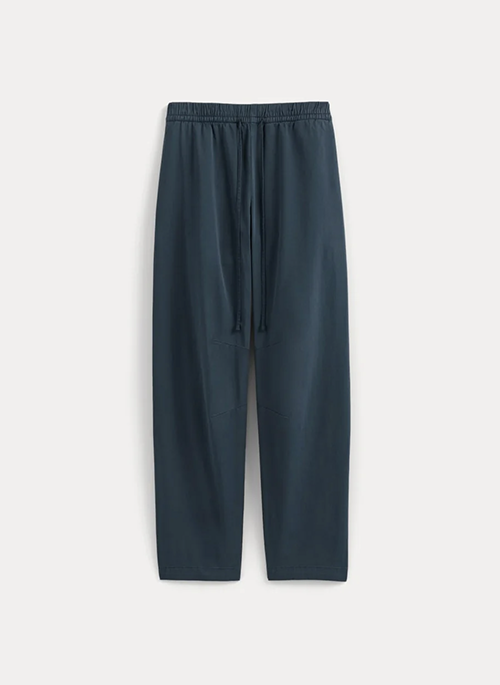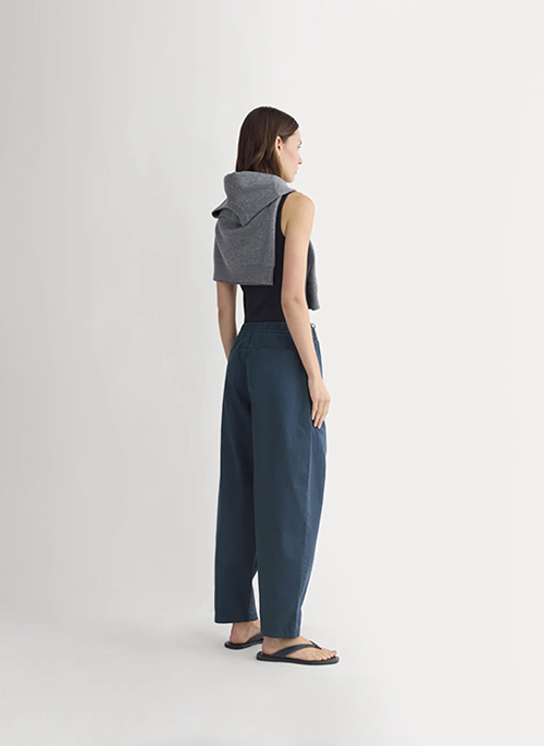 Comfort with a little flair. This pull-on cotton pant features a relaxed barrel silhouette that tapers softly through the leg. Made with lightweight organic cotton, it's breathable and airy, while the elastic waistband with a front tie gives added ease. Comfortable but intentional, it’s the kind of pant that works with simple tees, lightweight knits, or an easy button-down.Details:
