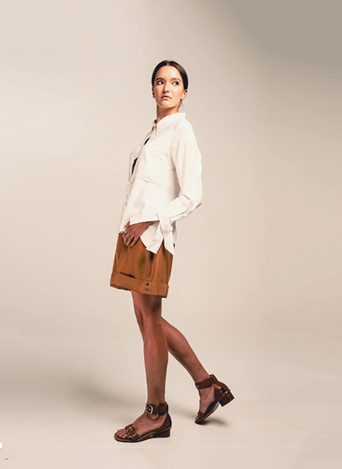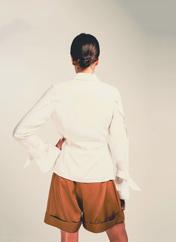 Our Bamboo Shirt is a modern twist on the classic white shirt. It is complete with statement sleeves, clear buttons and seam lines highlighting the waist. It is tailored in a Bamboo Silk which has a soft texture and drapes beautifully. This fabric has been produced without the use of harmful chemicals.