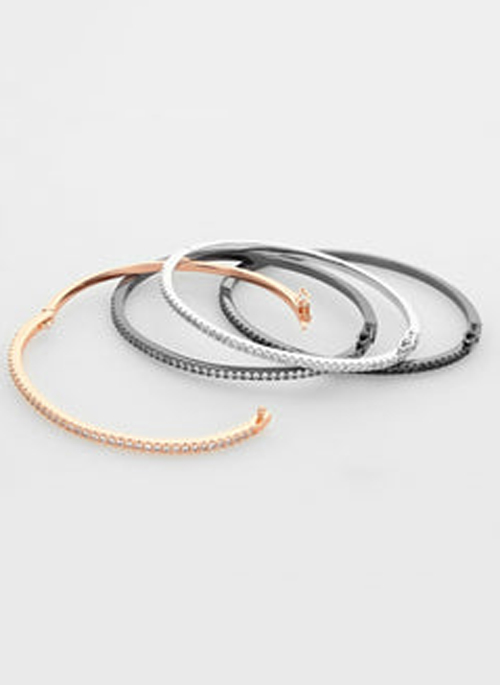 Details: Bangle with one row of micro pavé cubic zirconia. Material: Stainless steel Stone: Cubic zirconia Size: Best fit for size 7" wrist Closure: Socket side opening