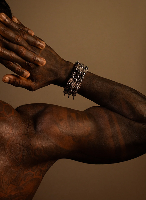 Handcrafted in NYC with polished silver hematite spheres and carved stainless steel beads, centered by MHART’s signature caged sphere—a symbol of protection and balance.Details: