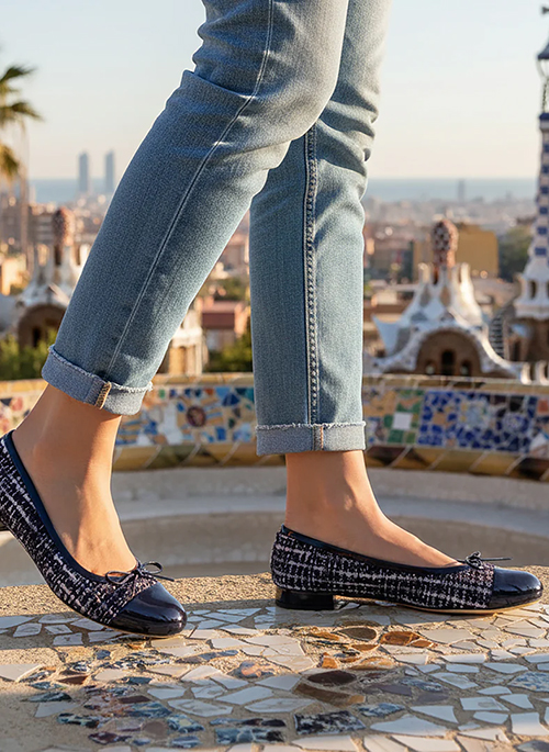 Elegant ballerina in navy tweed and with a round toe crafted in patent leather. This classic also features a padded insole for comfort.Details: 10mm6mm = 0.23"memory foam insole.Breathable suede upper, lining and sole.Closed toe.