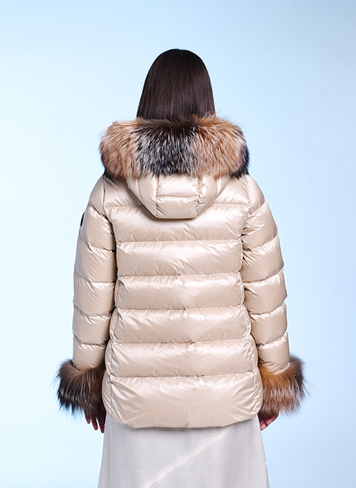 Women's short down jacket. Detachable hood with removable natural fur. Center closure with a custom double-zipper closure. Zippered pockets. Detachable natural fur cuffs. Water-repellent and windproof fabric. Thermoregulating down filling.Details: