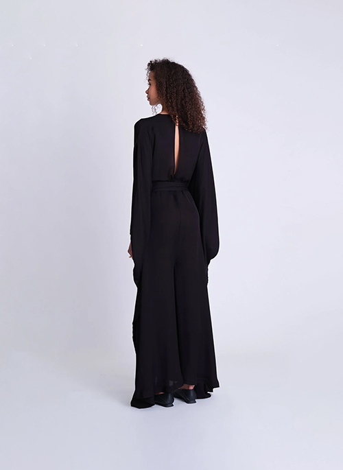 Details: Belted oversized jumpsuit kaftanSelf fabric sash belt to cinch in the waistMaxi lengthBack neck gold metallic button
