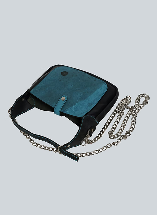 - The front showcases sky blue azul pufferfish leather paired with a rich black bovine leather.