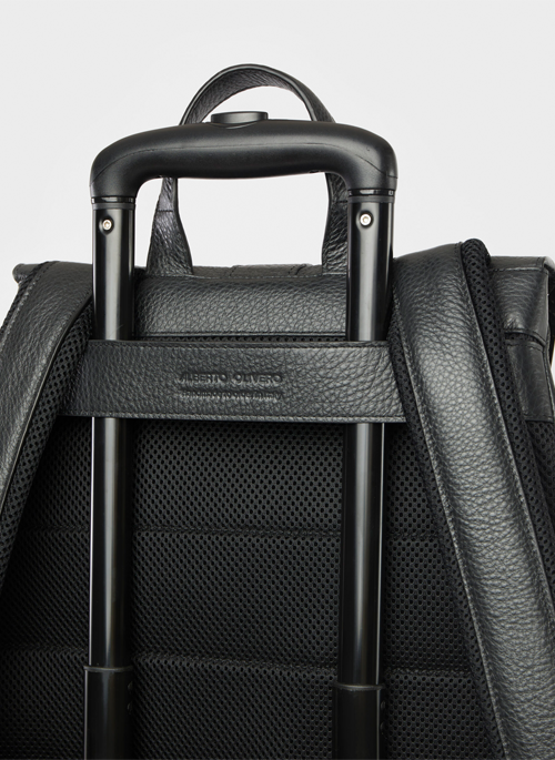 Comfortable and roomy, it features a padded, breathable back for added comfort. The accessory is embellished with the Alberto Olivero monogram logo in brass on the front.