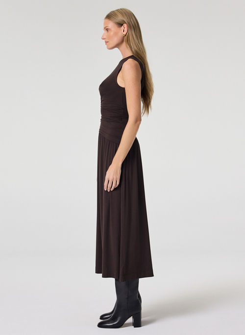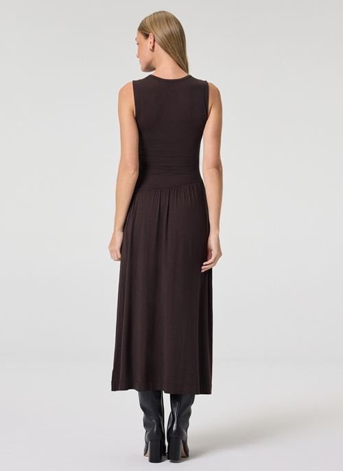 The Bonita Dress is made from our new drapey viscose jersey in a rich dark brown hue. Featuring a crew neckline and faux wrap detail, this sleeveless midi dress offers a flattering, versatile fit that can easily transition from day to night.