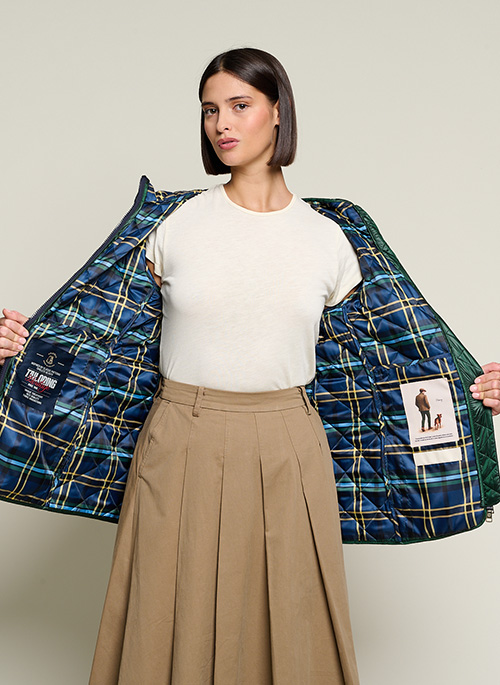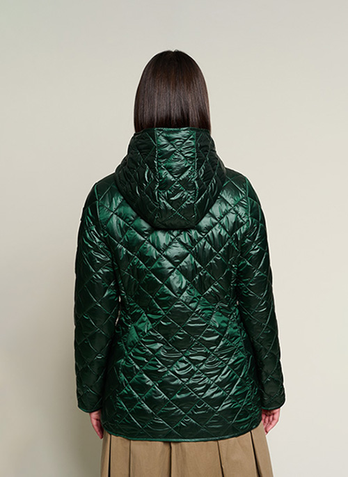Women's short husky-style down jacket. Zippered pockets. Center double-zipper closure. Printed lining. Fixed hood. Two inside pockets. Water-repellent fabric.