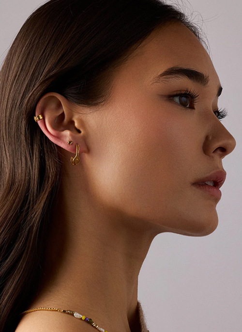 Crafted from 925 sterling silver and plated with 18k gold, the Bruno Ear Cuff features a delicate 7mm x 6mm x 3mm design. Its subtle pitted star pattern adds a refined texture, making it an expert choice for those seeking a minimalist yet distinctive accessory. This teeny tiny ear cuff offers a sophisticated way to elevate your look without the need for piercings.