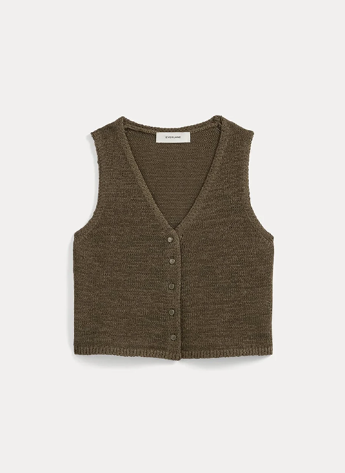 A light knit for summer. This airy, sleeveless V-neck tank features button closures at the center front. Made with a linen, organic cotton, and recycled nylon blended tape yarn, it has a crisp, textured feel, and holds its shape. Lightweight and breathable, it pairs easily with tailored shorts, relaxed trousers, or long skirts as the seasons shift.Details: