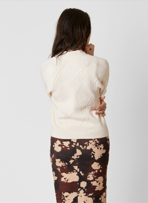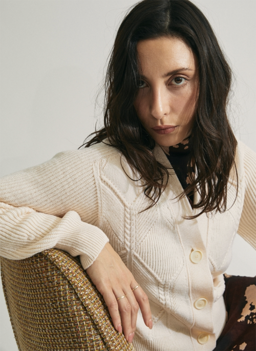 Our Caly Ecru jacket is a winter or mid-season jacket for women in pure 100% French merino wool knitted with a pretty set of diamond stitches and pearl ribs embellished with twists.