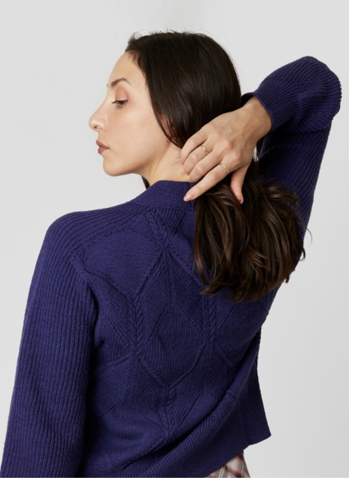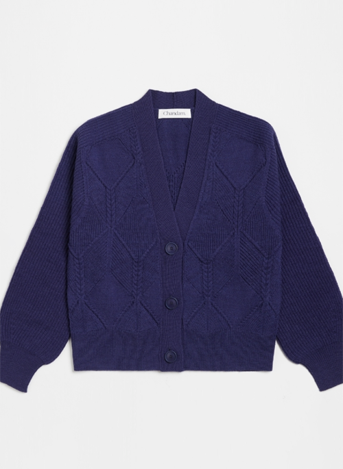 Our Caly jacket in Night blue color is a winter or mid-season jacket for women in pure 100% French merino wool knitted with a pretty set of diamond stitches and pearl ribs embellished with twists.