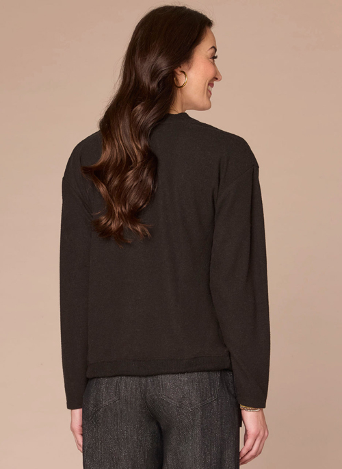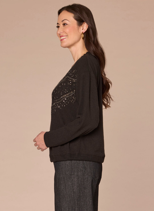 Whether you’re celebrating with friends or adding some shine to your workwear, this knit top suits several occasions. It has long sleeves, a V-neck, cased hem, and an embroidered sequin front.