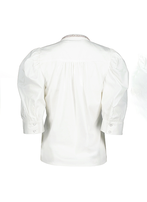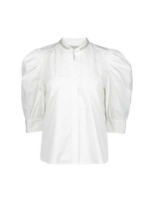 The Cate Ruched Sleeve Top reimagined in a crisp poplin, featuring an embellished collar. The button front closure keeps it polished, while the ruched sleeves adds a sense of femininity. Dress it up with tailored trousers or dress it down with your favorite jeans.Details: