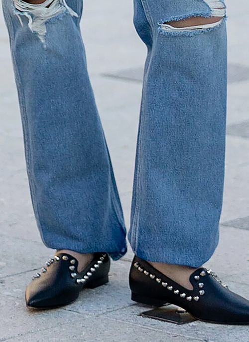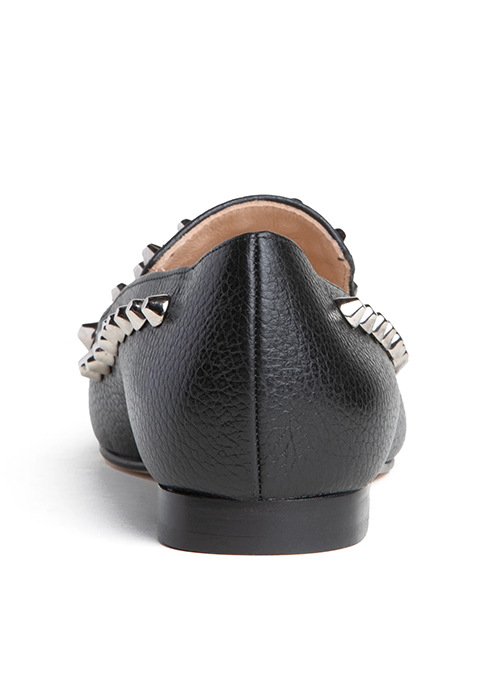 Fashion-forward black pebbled leather loafer. A row of studs gives this edgy flat some attitude. Celeste will not go unnoticed! Great for day or evening wear.Details:
