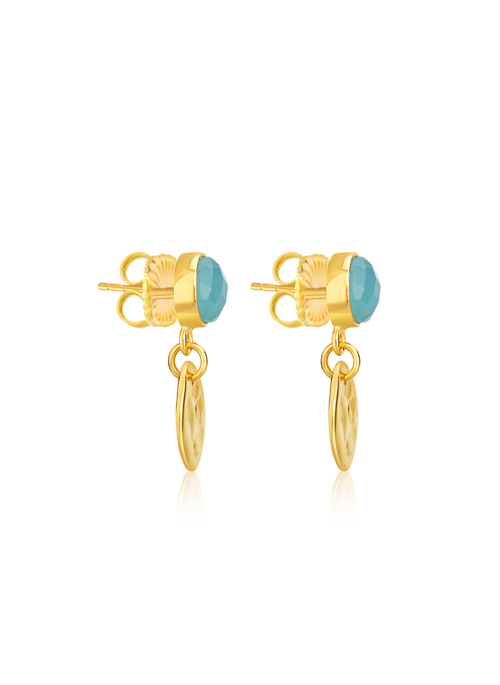 These 18ct yellow gold vermeil stud earrings feature a bezel-set blue chalcedony gemstone. Wear these all year round.