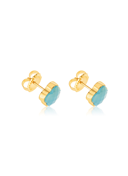 These 18ct yellow gold vermeil stud earrings feature a bezel-set blue chalcedony gemstone. Wear these all year round.