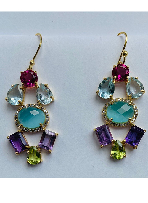 Drop earrings of Multicolor Stones in a cluster setting. Gold-plated Sterling Silver wire earring. Gemstones of aquamarine, amethyst, fuschia and peridot.