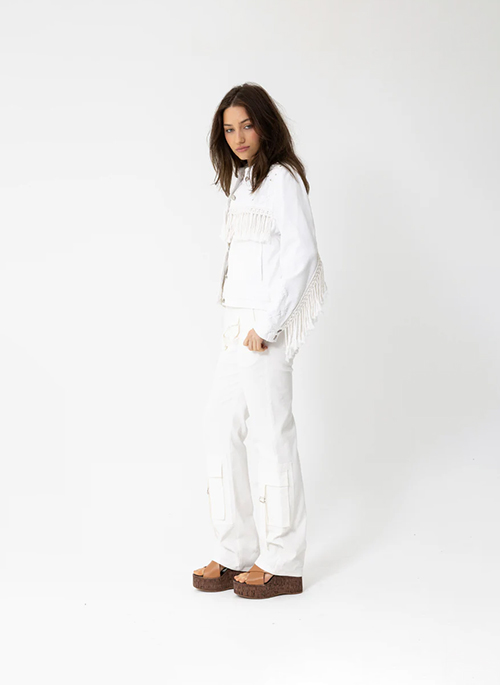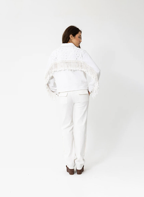 NYC COWGIRL JACKET - The coolest Jacket in Town. Inspired by the coolest girl JOEY met in Prince St, SOHO, NYC last year. This Beauty was wearing the coolest white denim, fringed jacket - Vintage of course. 100% White Cotton Denim. Embroidered with White Palm Trees and Studs. Topped off with fabulous cord fringing and silver hardware. This Jacket will get better with age, wear and washing. And it has cool Pockets.Details: