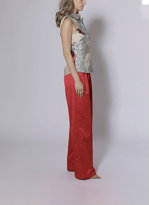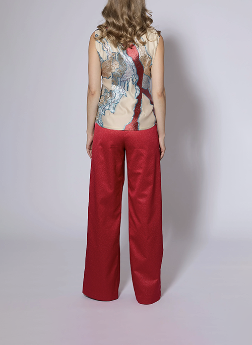 Details: Luxurious crepe "dusted" with lurexEasy fit trouser silhouette Slash pockets at hipZip at center back waistLined to the knee35 inches at inseam Fabric imported from France59 Polyester 28 Polyamide 13 Metallized FiberDry Clean Only