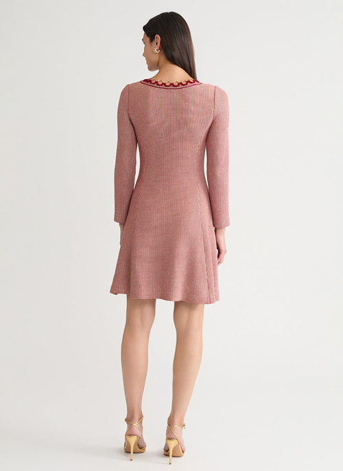 This knee-length A-line dress balances timeless femininity with radiant detail. Crafted in luminous lurex knit, it features a graceful scoop neckline, intricate crochet ring trim, and gleaming gold metal accents. Princess seams sculpt the silhouette with refined ease, making it the perfect choice for evenings that call for understated glamour.