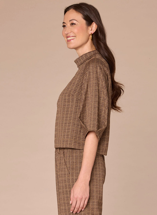 Soft, comfortable, and made for any type of day, this cropped knit top is sure to become a favorite in your rotation. It has elbow pleated sleeves, a mock neck, seaming details, and a shiny plaid design.