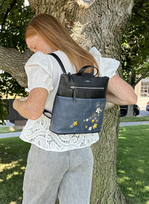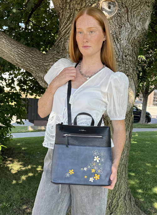 The Daisy is a backpack that transforms effortlessly into a fashionable crossbody bag. This chic style features an adorable daisy pattern and vibrant yellow accents to add a pop of color to any ensemble. The daisy BP also offers plenty of pockets and compartments to keep you perfectly organized.