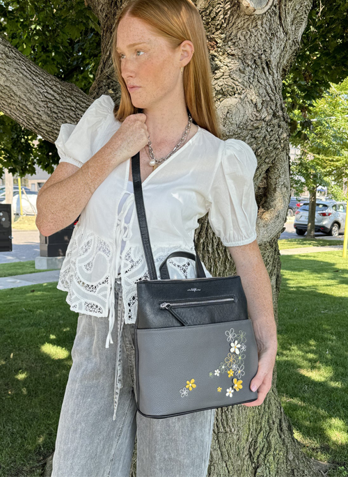 The Daisy is a backpack that transforms effortlessly into a fashionable crossbody bag. This chic style features an adorable daisy pattern and vibrant yellow accents to add a pop of color to any ensemble. The daisy BP also offers plenty of pockets and compartments to keep you perfectly organized.