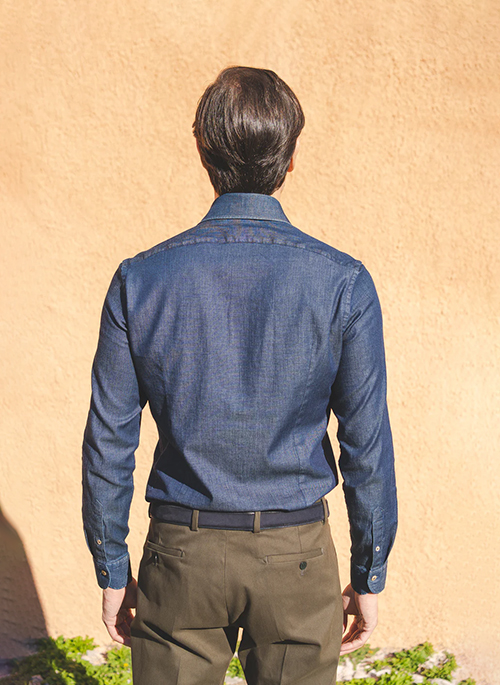Light Blue Denim Shirt is one of our most popular and versatile shirts. A wardrobe essential, made from Italian denim, garment washed for a softer fabric and featuring seam effects. A versatile and timeless shirt, suitable for any business or casual look constructed with shifted sleeve pattern with mother-of-pearl button and hand-finished buttonhole.Details: