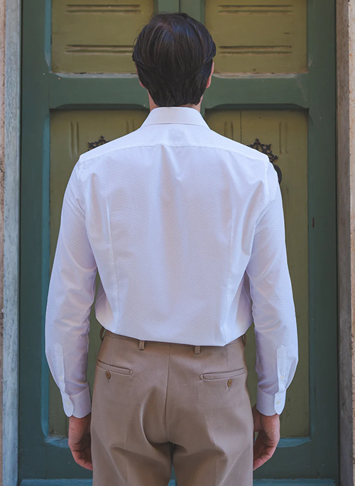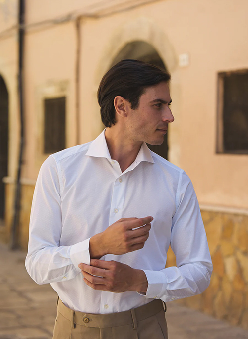 Dobby Shirt White Dots is a shirt in double twisted popeline 120/2 , handcrafted in Italy, with the tailored pattern of the shifted sleeve and enriched with mother-of-pearl button and handmade buttonhole trim.Details: