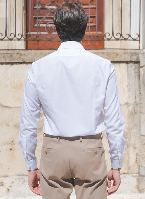Dobby Shirt White Rhombs is a shirt in double twisted popeline 120/2 , handcrafted in Italy, with the tailored pattern of the shifted sleeve and enriched with mother-of-pearl button and handmade buttonhole trim.Details: