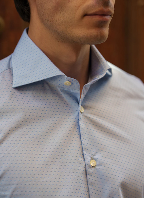 Dobby Shirt Azure Dots is a shirt in double twisted popeline 120/2 , handcrafted in Italy, with the tailored pattern of the shifted sleeve and enriched with mother-of-pearl button and handmade buttonhole trim.Details: