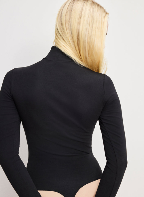 Our long-sleeved bodysuit hugs like a corset and shines like a star. With crystal detailing, a high neckline, and thong coverage for a clean finish, it’s your secret weapon under denim.