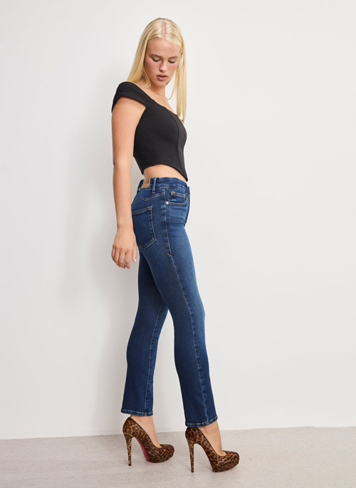 A versatile 5-pocket straight style, designed with a form-hugging fit from your waist to your thighs, that goes straight from thigh to ankle. Featuring a flattering mid-rise waistline, these jeans are made to accentuate your curves and provide a sleek silhouette that's both timeless and sexy.