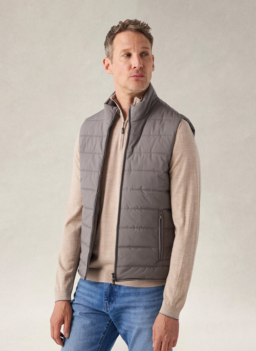 Robert Talbott’s Driver Quilted Vest is the ultimate layering piece. The Driver features lightweight fill that comes from recycled water bottles and a heather gray contrast interior lined with a cashmere jersey blend for luxurious comfort. With heat sealed quilted seams and a water-resistant shell, the Driver Vest offers a stylish level of comfortable protection. From an early morning walk on the beach, to a cool night in the desert, the Driver Vest is the perfect stylish and lightweight complement.